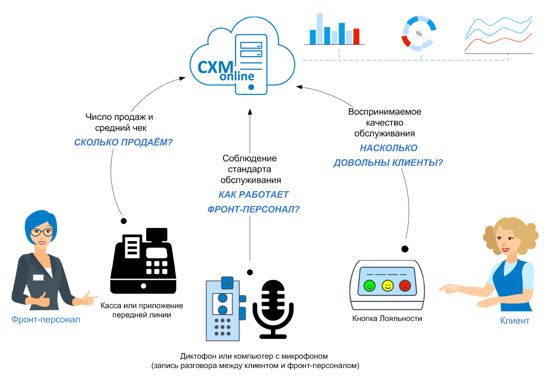 - Автоматически передаем всю получаемую информацию в облачный сервис CXM-online, по определенной технологии измеряем Вовлеченность Продавцов и определяем "узкие места" процесса продаж в зале.