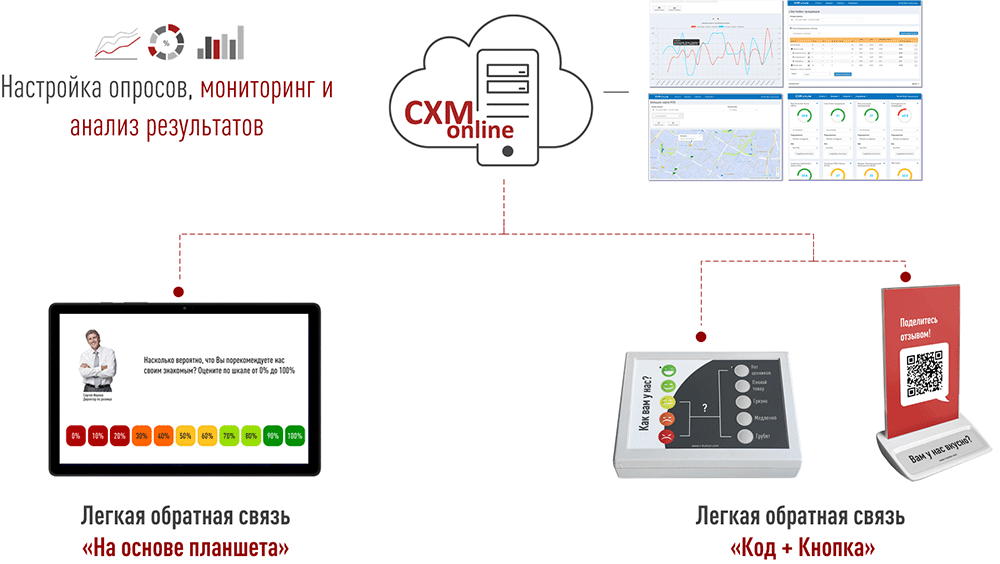 Большинство терминалов обратной связи, предлагаемых сегодня на Российском рынке, относятся к категории Легкой Обратной Связи. Мы предлагаем решения как для Легкой, так и для Профессиональной обратной связи, например Сенсорный Фронт Мотиватор, Терминал Обратной Связи и Сенсор Анкетер, Объединенный Пост Качества.