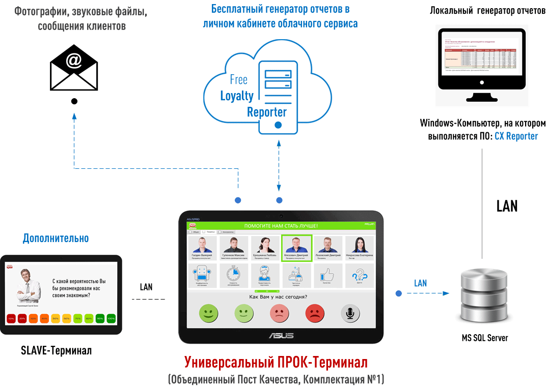 Универсальный ПРОК Терминал включает два решения = Объединенный Пост Качества + Терминал Обратной Связи и Сенсор Анкетер.