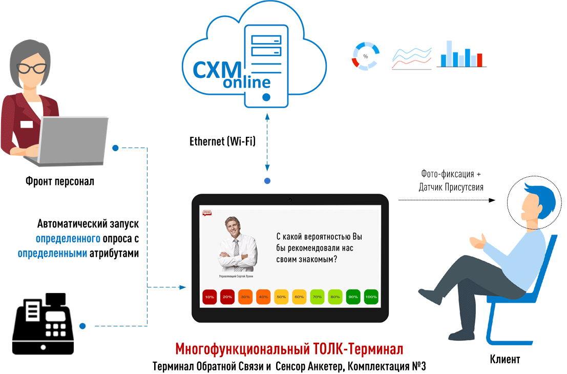 Многофункциональный ТОЛК Терминал = Сенсорный Фронт Мотиватор + Терминал Обратной Связи и Сенсор Анкетер.