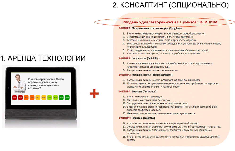 Подробнее о модели удовлетворенности клиентов и измеряемых показателях на примере клиники читайте в статье: Управление качеством медицинских услуг по восприятию пациентов.
