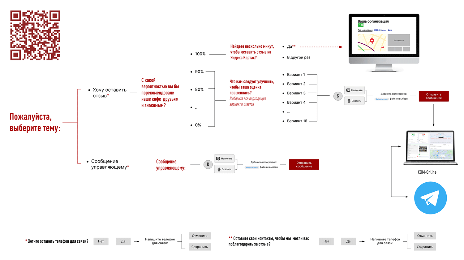 Клиентский позитив направляйте на Яндекс Карты и т.п. и повышайте репутацию своей организации. Клиентский негатив автоматически пересылайте в службу качества, систематизируйте причины недовольства клиентов и устраняйте имеющиеся «узкие места».
