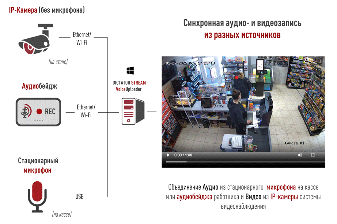 Синхронная аудио- и видеозапись, объединение и представление в удобном для анализа и управления виде потоковых данных, получаемых из разных источников. Например, Аудио, получаемого из стационарного микрофона (например, на кассе) или аудиобейджа работника, и Видео, получаемого из IP-камеры системы видеонаблюдения.