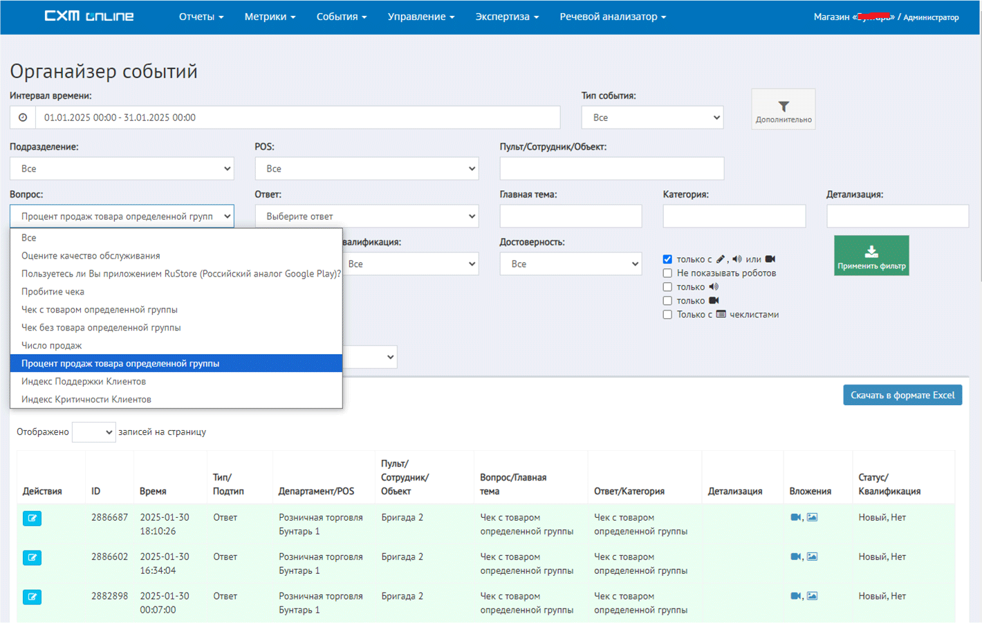 Вы получите возможность быстро находить все нужные события, например, пробития определенных чеков, ответы на определенные вопросы, обратную связь в определенных точках и т.п. Недостоверные события сможете удалять