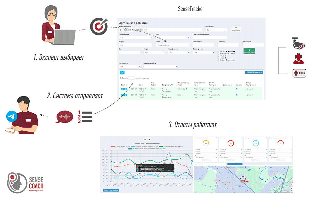 - SenseCoach отвечает на вопрос: «КАК сделать так, чтобы каждый сотрудник стабильно делал именно то, что нужно?». Ответ через коучинг и контроль качества.