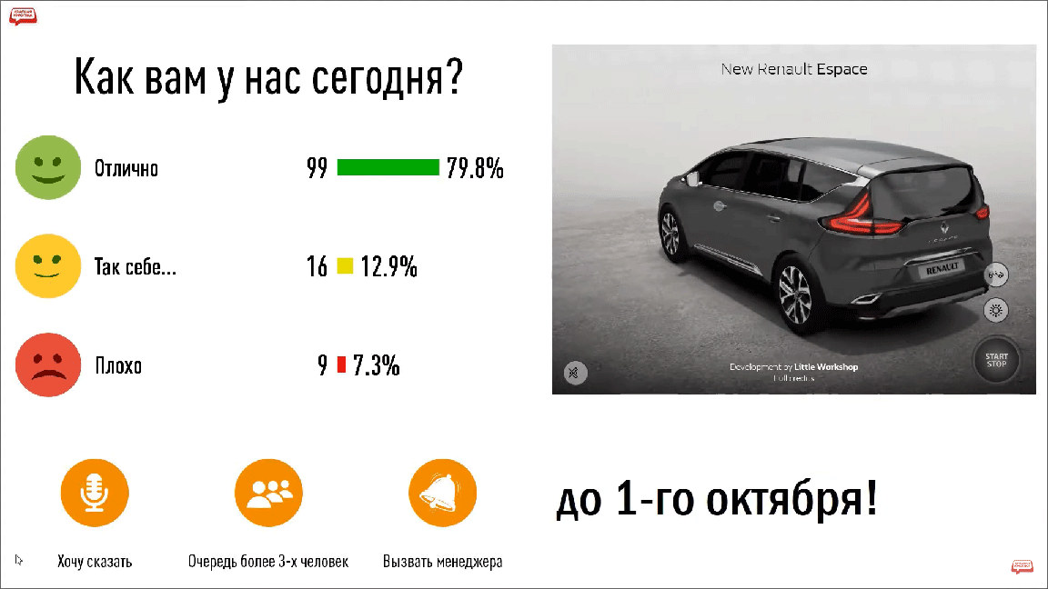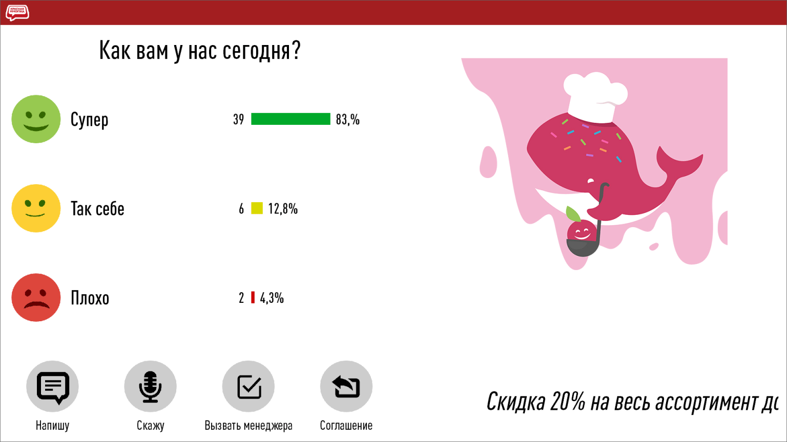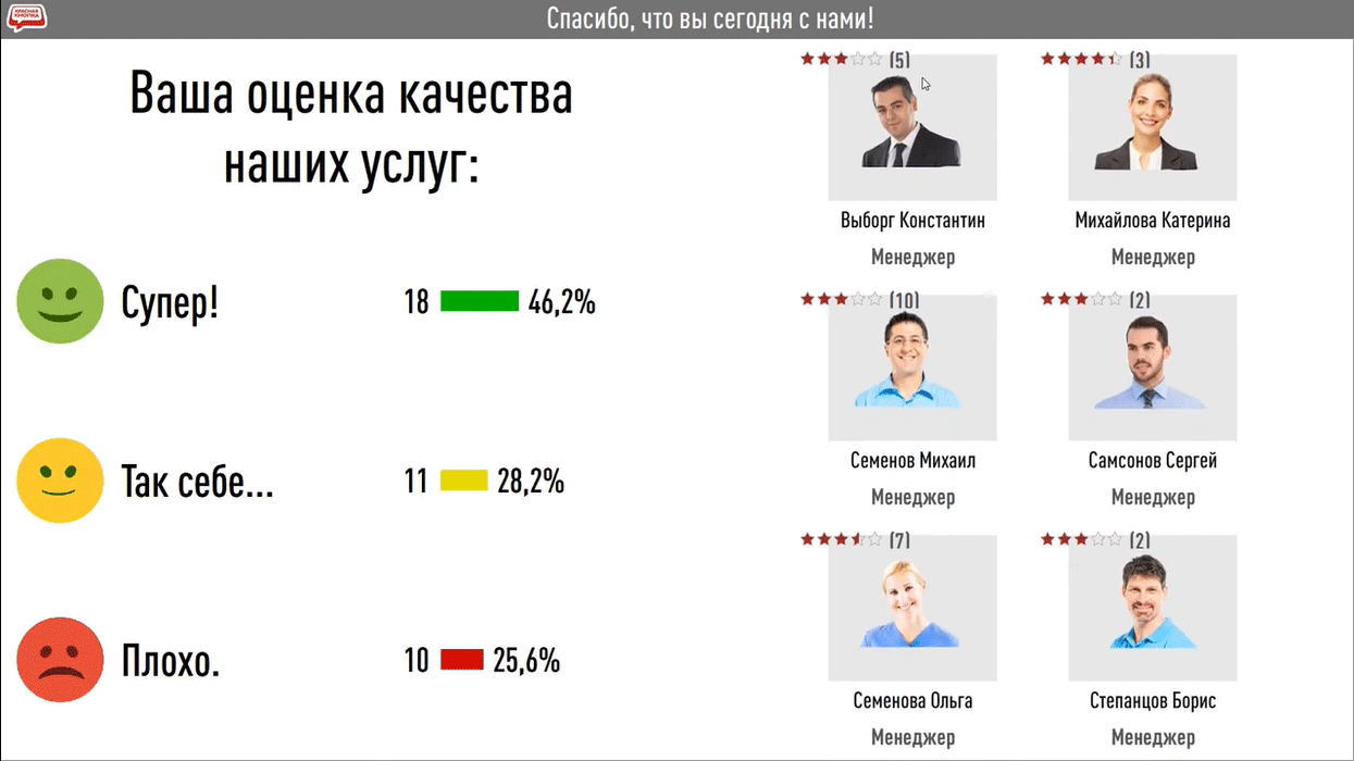 При размещении окна программы на сенсорном мониторе вы можете получить дополнительный пульт оценки качества обслуживания. Включите в настройках программы режим поддержки интерактивности и клиенты смогут давать оценки нажатием на соответствующий значок или текст оценки на экране.