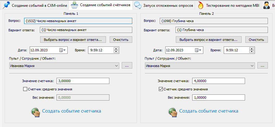 События счетчиков, в отличие от прочих событий, содержат информацию о значениях и весах значений. Обычно события счетчиков формируются в сервисе CXM-Online автоматически реальными счетчиками, например, счетчик посетителей, либо специальными программами, выполняющими расчет значений счетчиков и передающих их в сервис. Однако, когда значения счетчиков невозможно передавать автоматически, программа позволяет делать это вручную.
