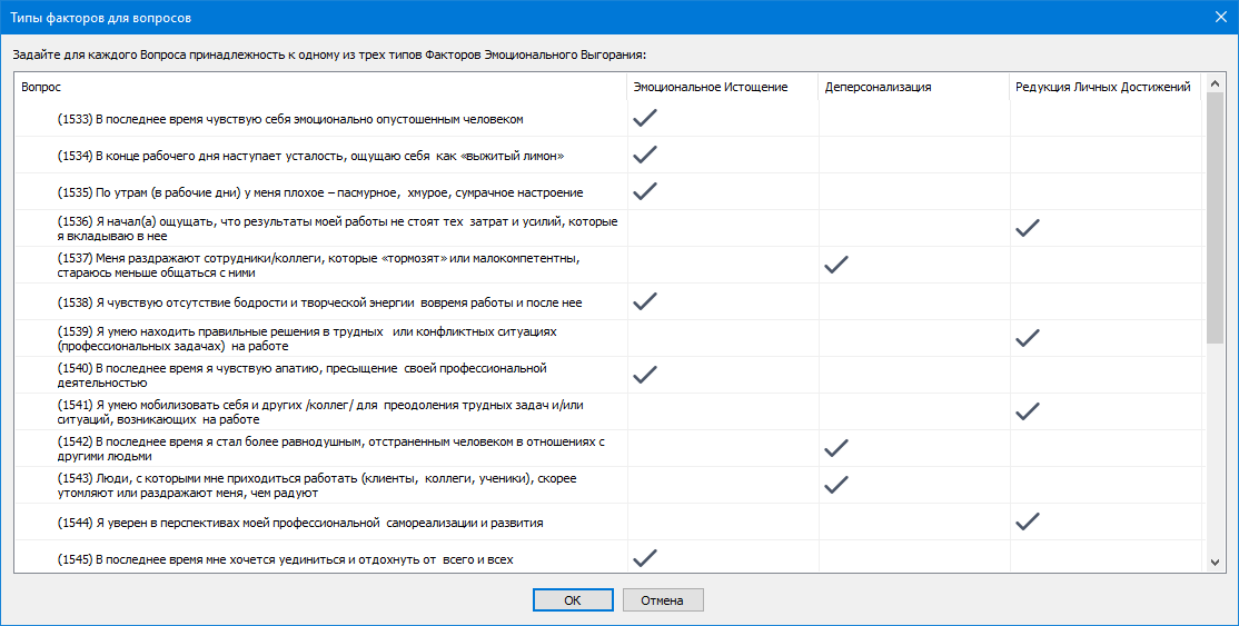Опрос – набор из 22 вопросов описывается в сервисе. В программе PastPoll вопросы, входящие в Опрос вручную одноразово связываются с одним из субфакторов «Эмоционального Выгорания», что необходимо для выполнения расчета результатов.