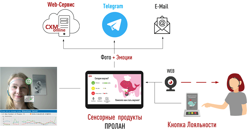 EmoScope используется для дополнения продуктов серии Кнопка Лояльности возможностью контролировать эмоциональный фон клиентов и/или фронт персонала во время оценки обслуживания.