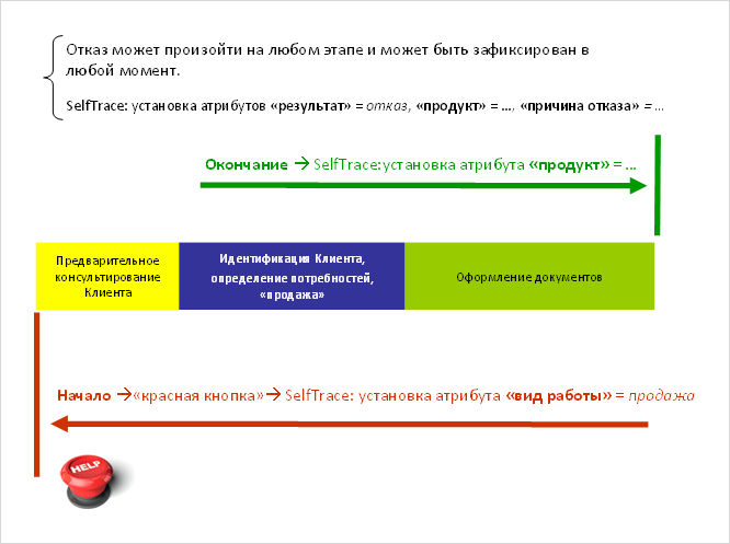 Кратко суть метода: «Хронометраж по кнопке» заключается в следующем. Начало выполнения Задания-Транзакции всегда фиксируется по нажатию Консультантом «красной кнопки». Окончание может фиксироваться по-разному, в зависимости от успешности сделки. Так, если Клиент уходит до того, как Консультант может его идентифицировать, то окончание фиксируется Консультантом вручную - установкой соответствующих атрибутов в программе SelfTrace. Если клиент был идентифицирован Консультантом с использованием CRM, то окончание может фиксироваться автоматически, по факту занесения соответствующей информации в базу данных СRM.