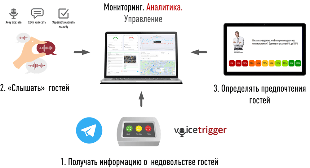 - Записи и систематизации Голоса Клиента во время ответов на ключевые вопросы фронт персонала.
