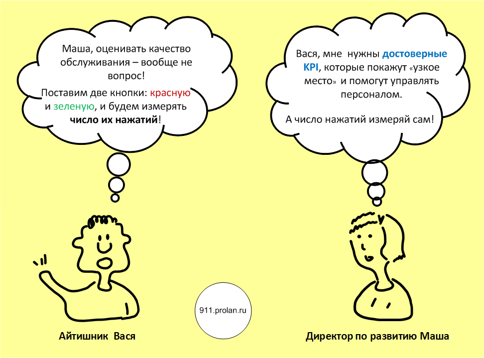 Поэтому технология оценки качества обслуживания, кроме технических средств (кнопок, программного обеспечения, системы видеонаблюдения и т.п.) должна включать в себя методику их применения. Такая методика изложена в [2]. В этой статье рассматривается практическое применение данной методики, при этом основной акцент делается на Ключевых Показателях Качества Обслуживания клиентов (КПКО), в частности, как эти показатели измерять, как контролировать их достоверность и как их можно использовать.