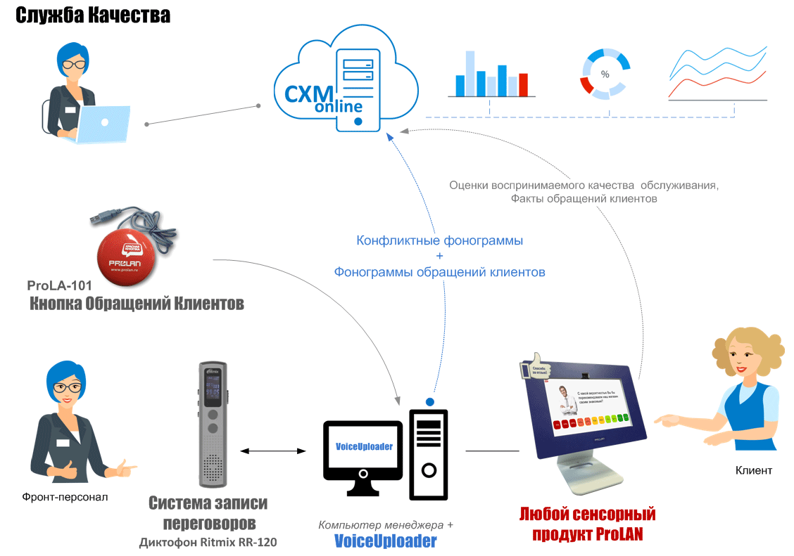 Менеджер Качества Обслуживания может быть реализован на основе любого сенсорного продукта ProLAN (Терминал Обратной Связи и Сенсор Анкетер, Объединенный Пост Качества, Сенсорный Фронт Мотиватор и другие).