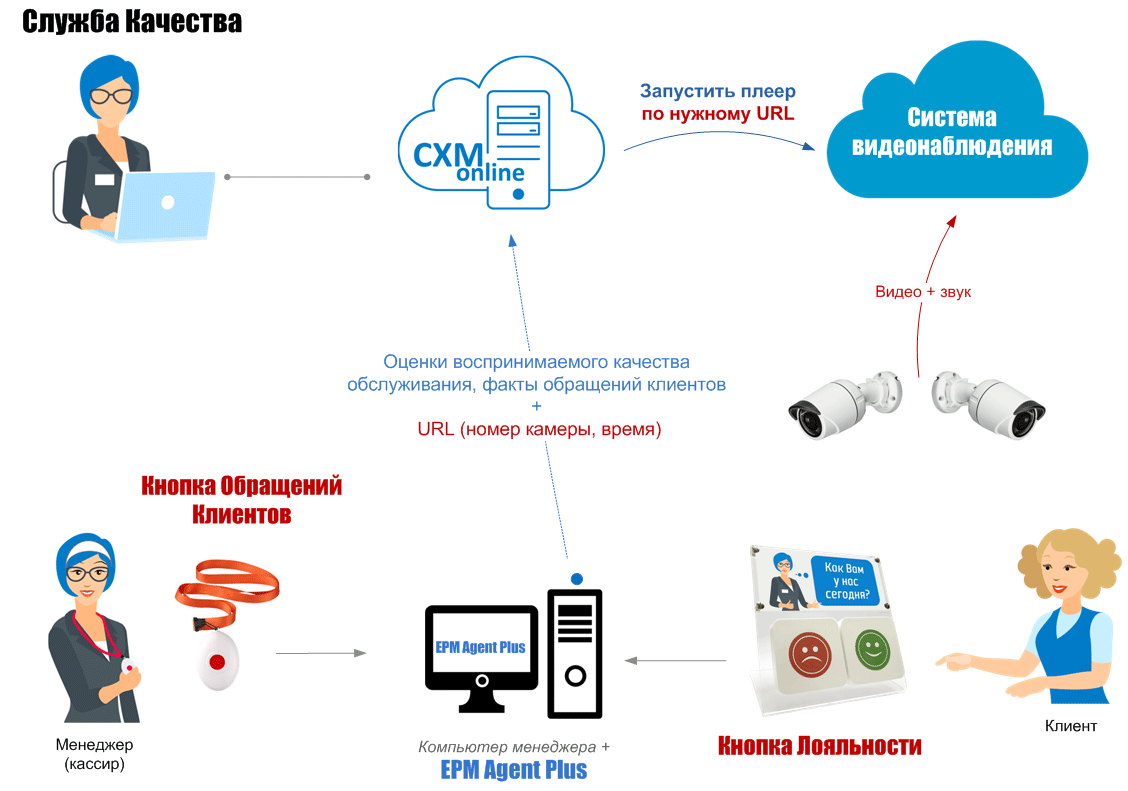 В качестве системы записи переговоров может использоваться система видеонаблюдения. В этом случае каждому событию, передаваемому из программы EPM Agent Plus в CXM-Online (обращения клиентов, оценки обслуживания) автоматически добавляется специальный URL. Формат URL соответствует требованиям используемой системы видеонаблюдения и содержит, в частности, номер камеры и время события.