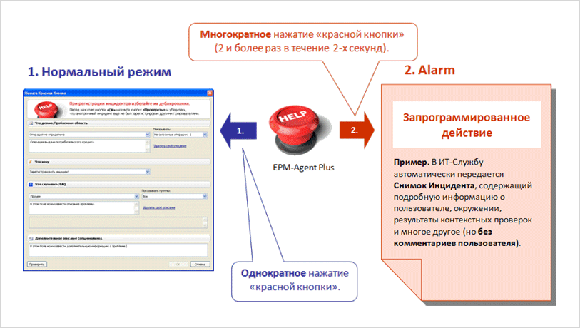 Кнопка Помощи ITSM (ранее: Красная Кнопка ITSM) и ряд других решений, использующих программный агент EPM-Agent Plus, поддерживает два режима работы: Нормальный и ALARM (рис. 1). Режимы различаются способом нажатия «кнопки». Нормальный режим соответствует однократному нажатию. Режим ALARM соответствует нажатию «кнопки» и удержанию её в нажатом состоянии в течение 2-х и более секунд. «Кнопка» — это сочетание клавиш (обычно Win+F12) или специальная аппаратная кнопка ProLAN-101.