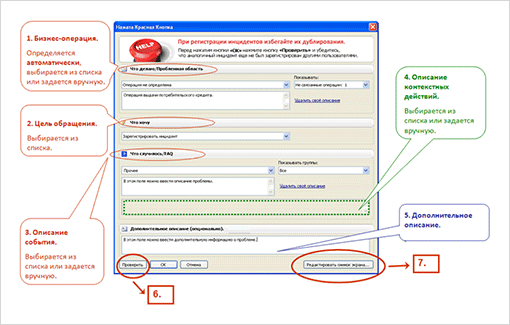 - Бизнес-операция (Что делаю/Проблемная область). В этой секции пользователю предлагается выбрать выполняемую бизнес-операцию или область, связанную с целью нажатия «красной кнопки». Выбор делается из списка «Что делаю/Проблемная область», автоматически загружаемого из Файла Конфигурации. Если критерий для данной операции был определён (в Файле Конфигурации), то наименование этой бизнес-операции выводится автоматически. Если критерий определён не был или этому критерию соответствует несколько бизнес-операций, то пользователю предлагается выбрать операцию или проблемную область вручную. Если в предложенном списке подходящего выбора нет, пользователь может добавить своё (новое) описание.
