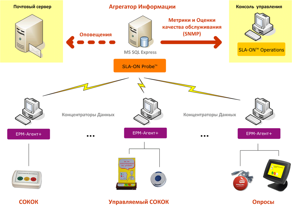 Клиент в любое время нажимает кнопку пульта; информация о нажатой кнопке записывается в базу данных Агрегатора Информации. Зонд SLA-ON Probe определяет, сколько индикативных кнопок каждого вида (красная, зеленая, серая) нажималось на каждом пульте и автоматически формирует следующие МКО.