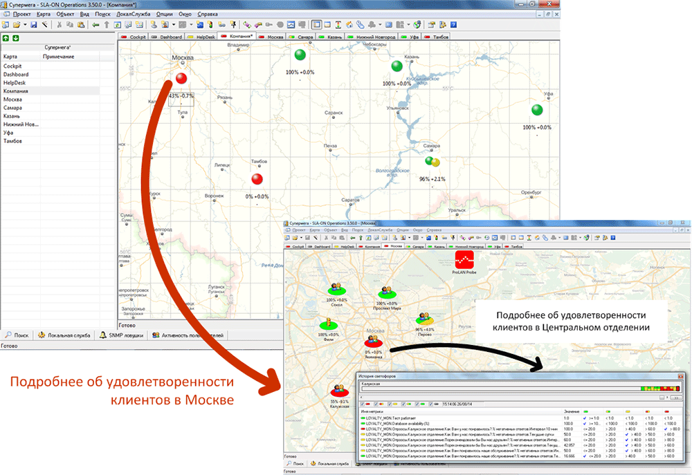 Карта Plan обычно используется для визуального контроля удовлетворенности клиентов в географически распределенных точках обслуживания. С её помощью руководитель службы качества может видеть текущие значения ОКО в каждом регионе и историю их значений за несколько последних часов. Увидев плохое (красное) значение ОКО в каком-то регионе, он кликает мышкой на соответствующую пиктограмму. После чего автоматически "проваливается" (drill down) на карту соответствующего региона, где может видеть ОКО по каждой точке обслуживания в этом регионе.