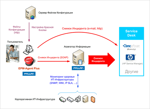Решение также может быть интегрировано с внешними системами Service Desk, такими как HP Service Management, BMC Remedy и др.