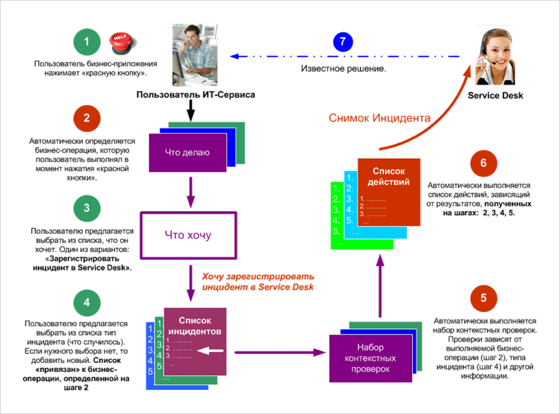 - Сбор необходимой информации об инциденте и регистрация его в Service Desk с минимальным участием пользователя и инженеров поддержки