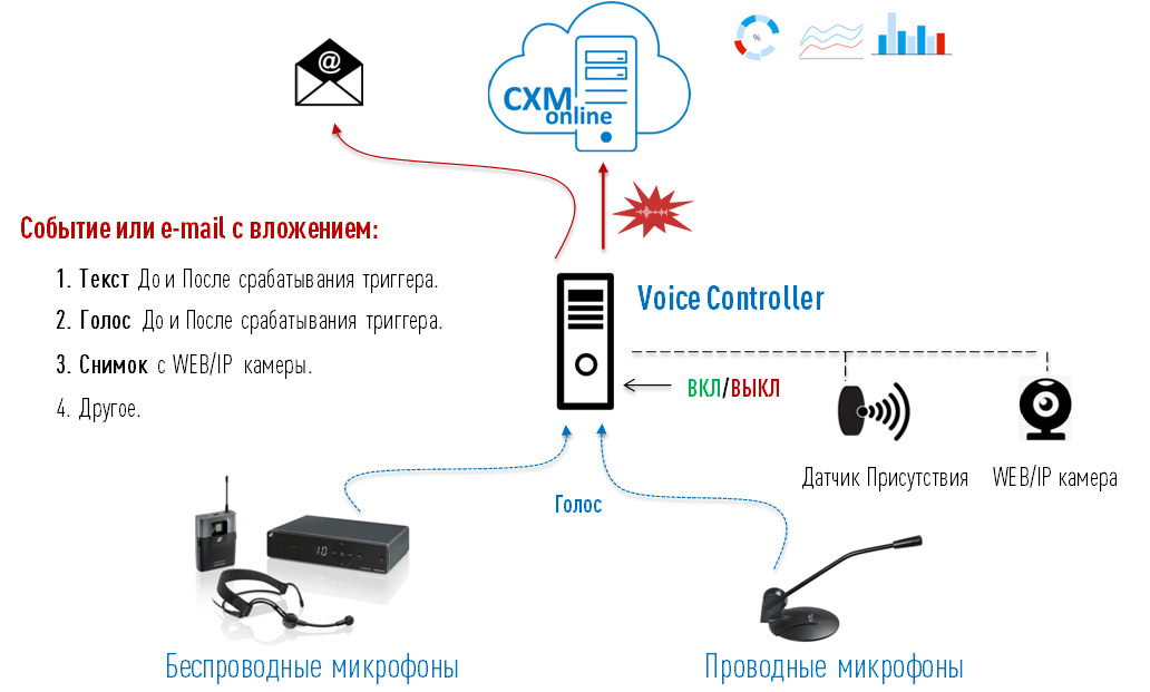 - Создание в облачном сервисе CXM-Online соответствующего события со следующими вложениями: звуковой трек и транскрибированный текст, соответствующие 30 сек. интервалу ДО и ПОСЛЕ срабатывания триггера, фото с камеры, сделанное в момент начала сеанса.