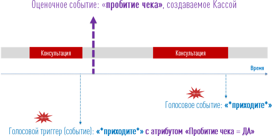- При анализе речи с привязкой к базовым событиям проверяется последовательность происходящих событий. Например, если после события Консультация, созданного голосовым триггером "*приходите*" до следующего голосового события "*приходите*" было пробитие чека, то атрибут "Пробитие чека" предшествующего (первого) голосового события будет иметь значение ДА. Если пробития чека не было, то значение НЕТ.