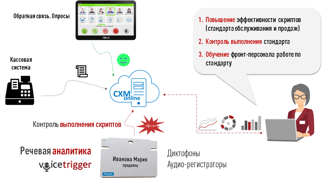 Речевая аналитика VoiceTrigger интегрируется с решениями для получения обратной связи от клиентов, бизнес-приложениями передней линии (например, с кассовыми системами) и CRM. Речевая аналитика VoiceTrigger - ключевой элемент решений Менеджер Качества и Эмоциональный NPS.
