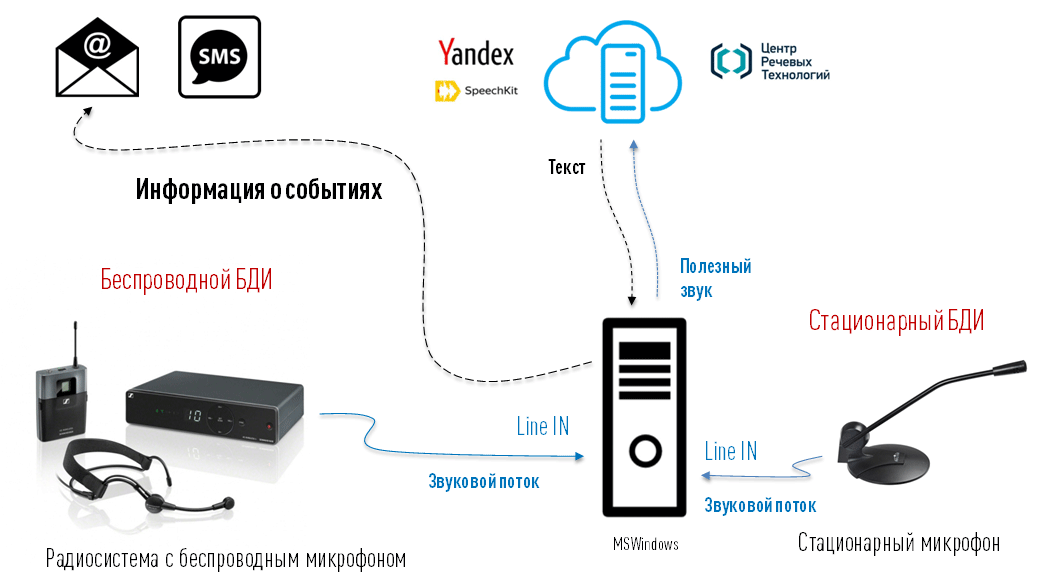 БДИ может быть как стационарным, так и беспроводным. В первом случае используется стационарный микрофон, подключаемый к Windows-компьютеру. Во втором случае к Windows-компьютеру подключается радиосистема с беспроводным микрофоном. В обоих случаях для подключения предпочтительнее использовать аналоговый вход.