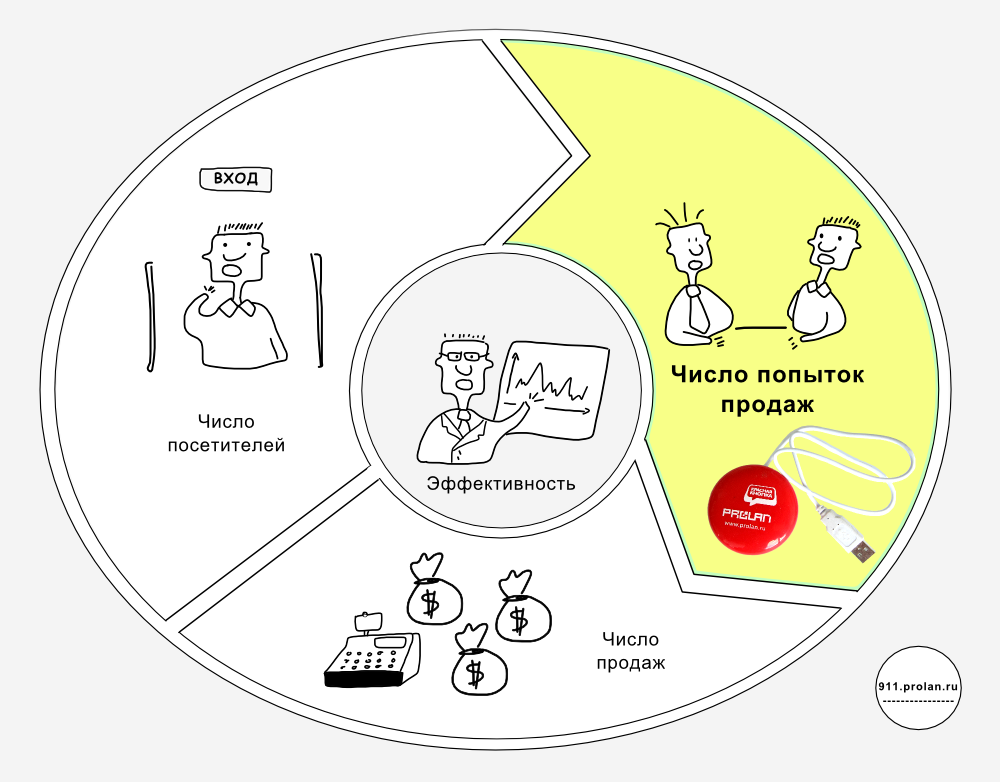 В отличие от других систем, Кнопка Активности Продавцов подсчитывает и учитывает при оценке эффективности персонала не только число посетителей торговой точки и число совершённых сотрудником продаж, но и число сделанных им попыток продаж.