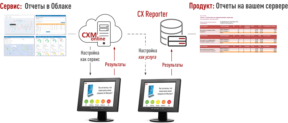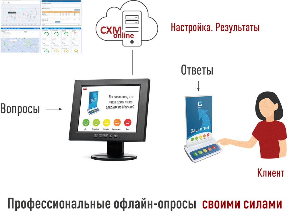 - Облачный сервис CXM-Online, используемый для создания опросов, загрузки опросов на опросные компьютеры и визуализации получаемых результатов.