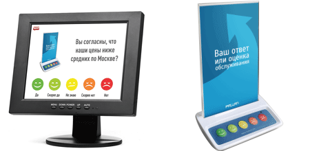 - Режим 2: Репрезентативные опросы с управляемой выборкой. В этом случае опрос начинается по инициативе персонала (нажатием кнопки) или по внешнему событию, например, пробитию чека, появлению клиента, фиксируемому с помощью датчика присутствия и т.п.