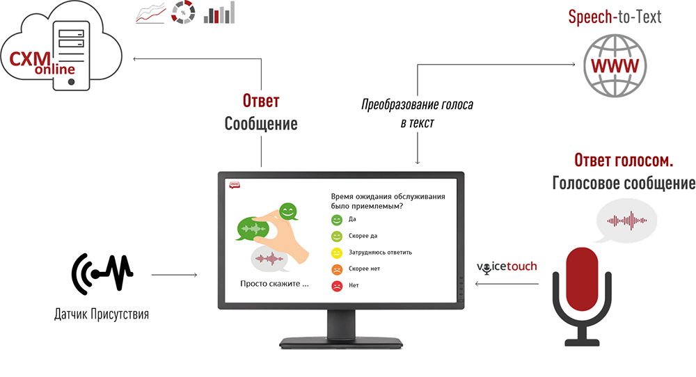 Кнопка Анкетёр может поставляться с технологией VoiceTouch, позволяющей клиентам отвечать на вопросы не нажатием кнопок, а произнесением варианта ответа вслух (отвечать голосом). Это решает несколько задач: