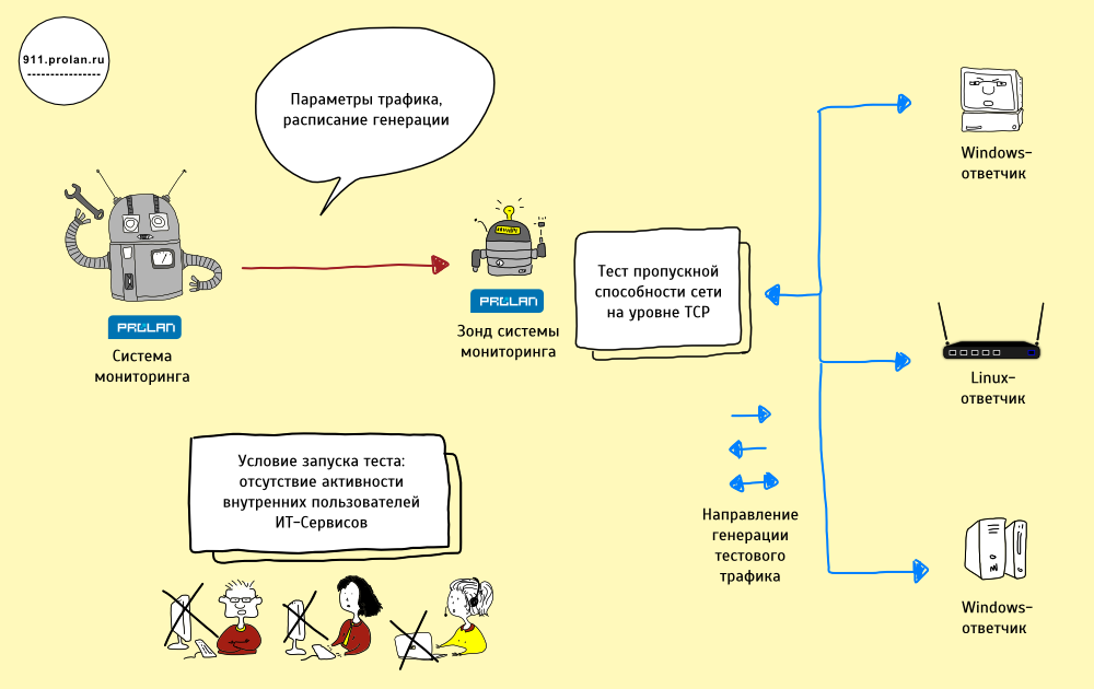 Тест пропускной способности сети на уровне TCP – это VB-скрипт, выполняемый на Зонде. Зонд – компьютер, работающий под управлением любой версии MS Windows, на котором выполняется служба MS Windows SLA-ON Probe. Работа Теста основана на генерации TCP-Трафика между Зондом и Ответчиками, и измерении объёма передаваемых и принимаемых данных. Ответчик – это служба Linux или Windows, которая может работать на серверах или встраиваться в активное оборудование. SLA-ON Probe входит в состав любого продукта семейства ProLAN SLA-ON (Администратор, Аналитик, Эксперт), но может использоваться и в составе любой системы управления, поддерживающей SNMP, т.к. позволяет экспортировать результаты измерений (пропускную способность и другие метрики) по SNMP. Для этого SLA-ON Probe поддерживает private MIB ProLAN.