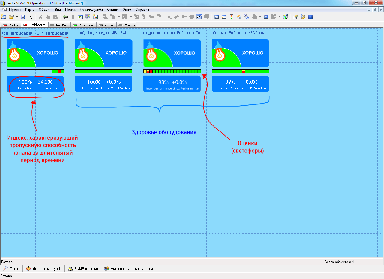 Здоровье сети характеризуется множеством метрик – утилизация, ошибки, джиттер, число потерянных пакетов и т.д. Значения этих метрик влияют на пропускную способность сети, поэтому выход любой из них за допустимый диапазон значений вызывает снижение пропускной способности сети. Таким образом, чтобы узнавать о проблемах до того, как они скажутся на работе пользователей, достаточно контролировать пропускную способность сети, что дешевле, проще и удобнее, чем контролировать множество «сырых» метрик.