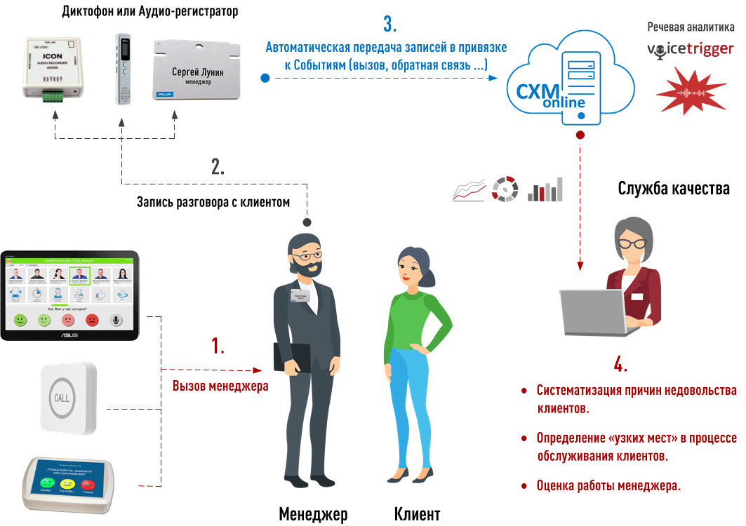 Запись разговора между менеджером и вызвавшим его клиентом и/или фронт персоналом и клиентом автоматически записывается на аудио регистратор или диктофон, автоматически передается в сервис CXM-Online, автоматически «привязывается» к сигналу вызова (нажатие кнопки вызова, кнопки качества, оставление обратной связи на терминале). Дополнительно, если требуется, автоматически транскрибируется с использованием речевой аналитики VoiceTrigger.