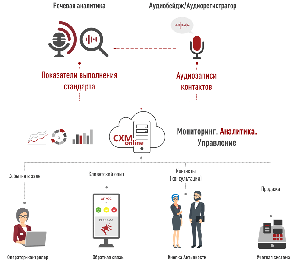 - Достоверность получаемой информации о выполнении персоналом стандартов обслуживания и продаж. Фиксируются все контакты с клиентами. Человеческий фактор отсутствует.