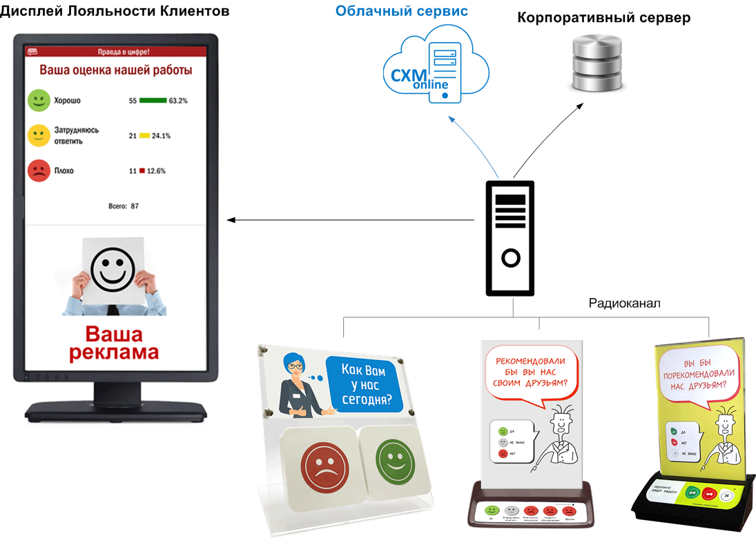 Вся получаемая информация (нажатия кнопок, оценки покупателей, фотографии и т.п.) автоматически передается в общую базу данных. Туда же могут передаваться данные о числе посетителей, числе продаж, результаты проверок Тайных покупателей и другая информация.