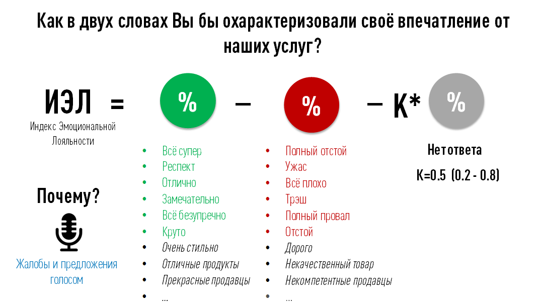 Терминал VoiceClik позволяет автоматически получать списки всех слов и выражений, характеризующих впечатления клиентов, разносить их по категориям, оценивать долю каждой категории. Это и есть Голос Клиента (Voice of Customer) в прямом и переносном смысле. Сегодня на рынке нет других инструментов, которые без проведения "токсичных" опросов позволяли бы слышать Голос Клиента с такой же детализацией, достоверностью и репрезентативностью.
