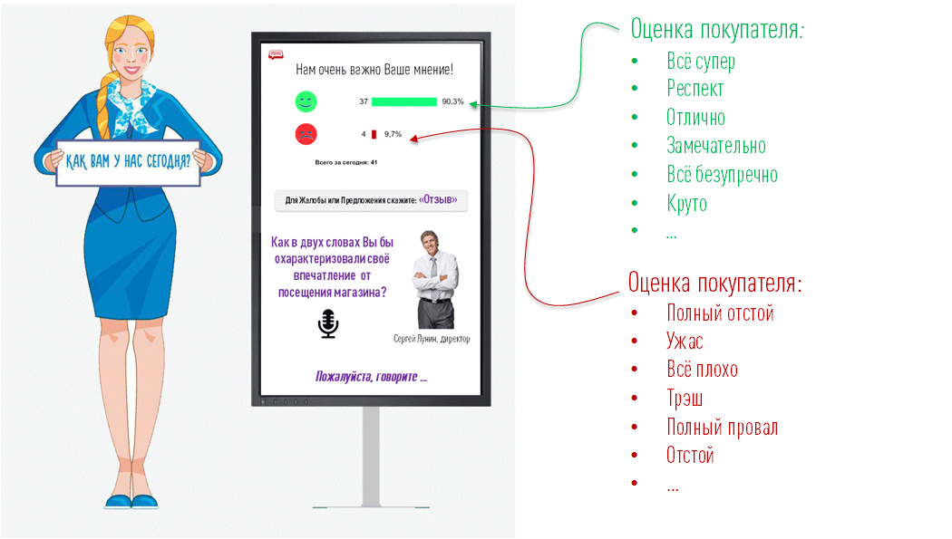 На Терминале клиентам задается вопрос типа: "Как Вам у нас сегодня понравилось?" и предлагаются конкретные варианты ответа, например, "Понравилось", "Так себе", "Плохо". Другие варианты ответа не принимаются.