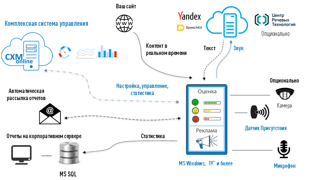 Для голосового управления используется технология VoiceTouch. Для преобразования голоса в текст может использоваться как Яндекс Облако, так и платформа ЦРТ.
