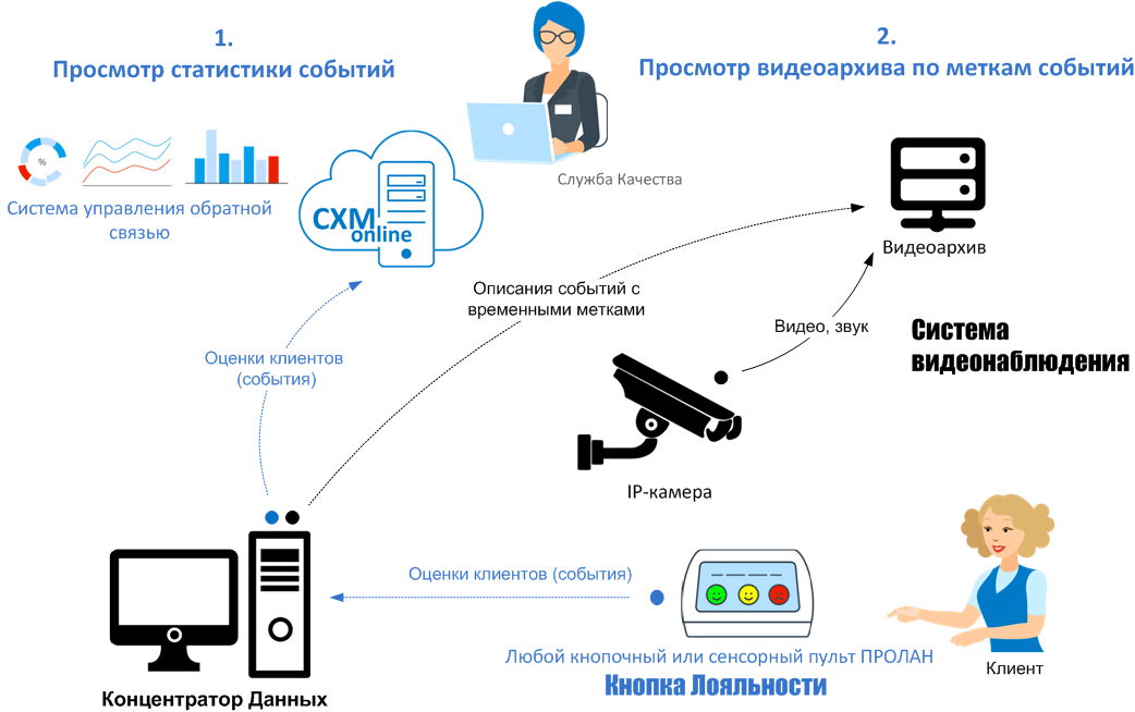 При нажатии клиентом Кнопки Лояльности, информация о нажатии автоматически передается как в систему управления обратной связью (может быть: Loyalty Reporter, CX-Reporter, CXM-Online), так и в видеоархив системы видеонаблюдения, где отображается как временная метка. Это позволяет просматривать и прослушивать запись общения клиента с фронт-персоналом до и после нажатия Кнопки Лояльности.