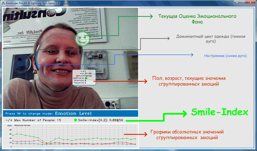 Что касается «джентльменского набора», ЭмоСкоп не лучше и не хуже других подобных систем. Его «фишка» в другом. ЭмоСкоп поддерживает ряд функций, которые делают его эффективным средством управления качеством обслуживания. В первую очередь, это возможность контролировать всплески эмоций, отображать «живые» смайлики, вычислять эмо-индексы (KPI клиентоцентричности).