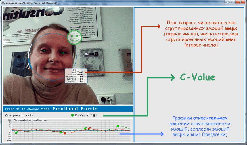 Первая особенность ЭмоСкопа - он «умеет» измерять не только абсолютные значения эмоций, но и всплески относительно среднего уровня, который был до этого. Абсолютные значения эмоций зависят от погоды, дня недели, времени суток и т.п. Всплеск эмоции – это всегда реакция на какую-то ситуацию. Например, продавец фыркнул, и смерил вас презрительным взглядом. Или, наоборот, сделал неожиданный подарок. Поэтому для управления качеством обслуживания это важно.