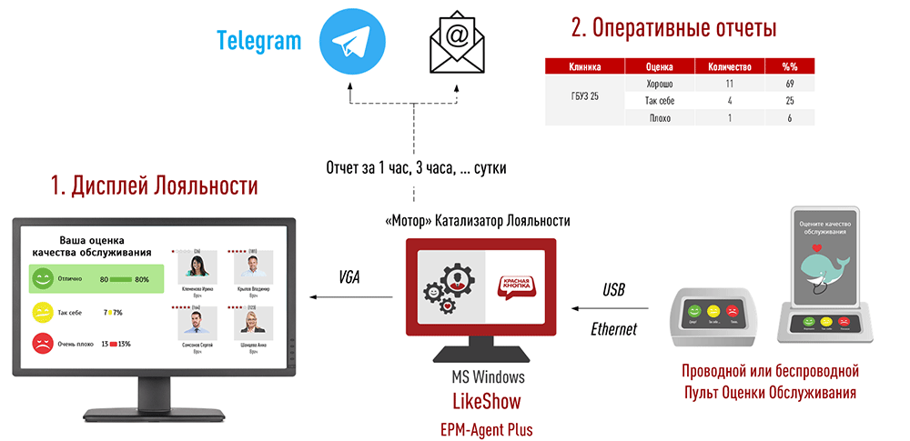 «Мозгом» решения является программа EPM-Agent Plus, работающая на Windows-компьютере. В качестве Пультов Оценки Обслуживания можно использовать: