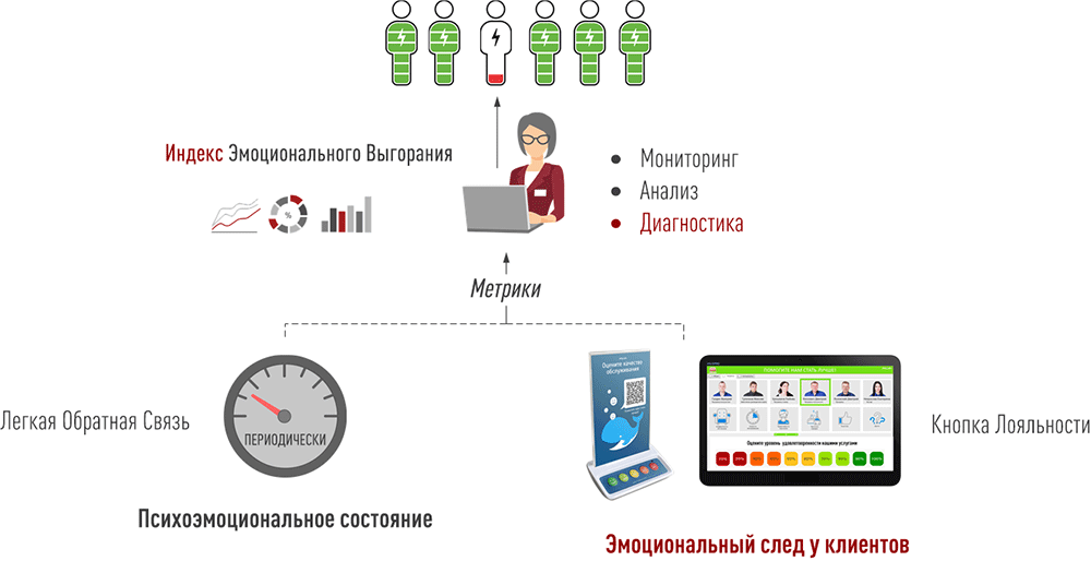 Если работа с клиентами происходит только офлайн (офис обслуживания клиентов, регистратура клиники и т.п.) и нужно простое решение, познакомьтесь с Легким монитором эмоционального выгорания фронт персонала.