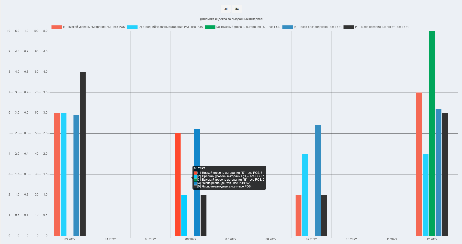 На основе результатов оценки по каждому работнику автоматически рассчитывается показатель: Индекс Психоэмоционального Состояния (ИПС). Дискретность данных ~ 1 месяц.