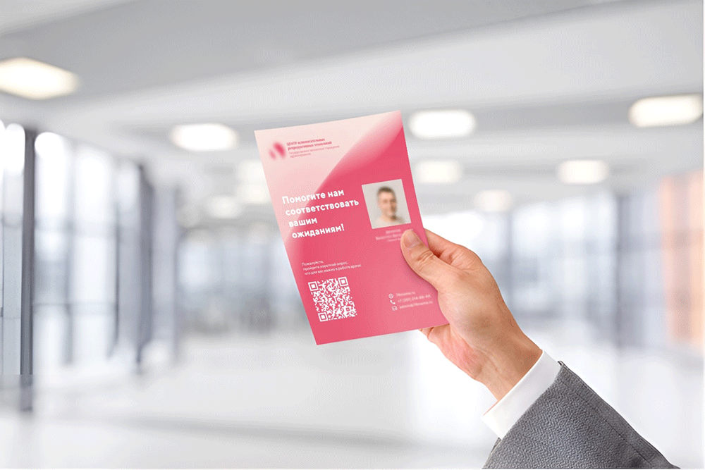 - В зоне регистратуры размещаются карточки с QR-кодом, ведущим на онлайн-опрос. Администратор просит пациента в удобное время, например, во время ожидания приема, пройти этот опрос.