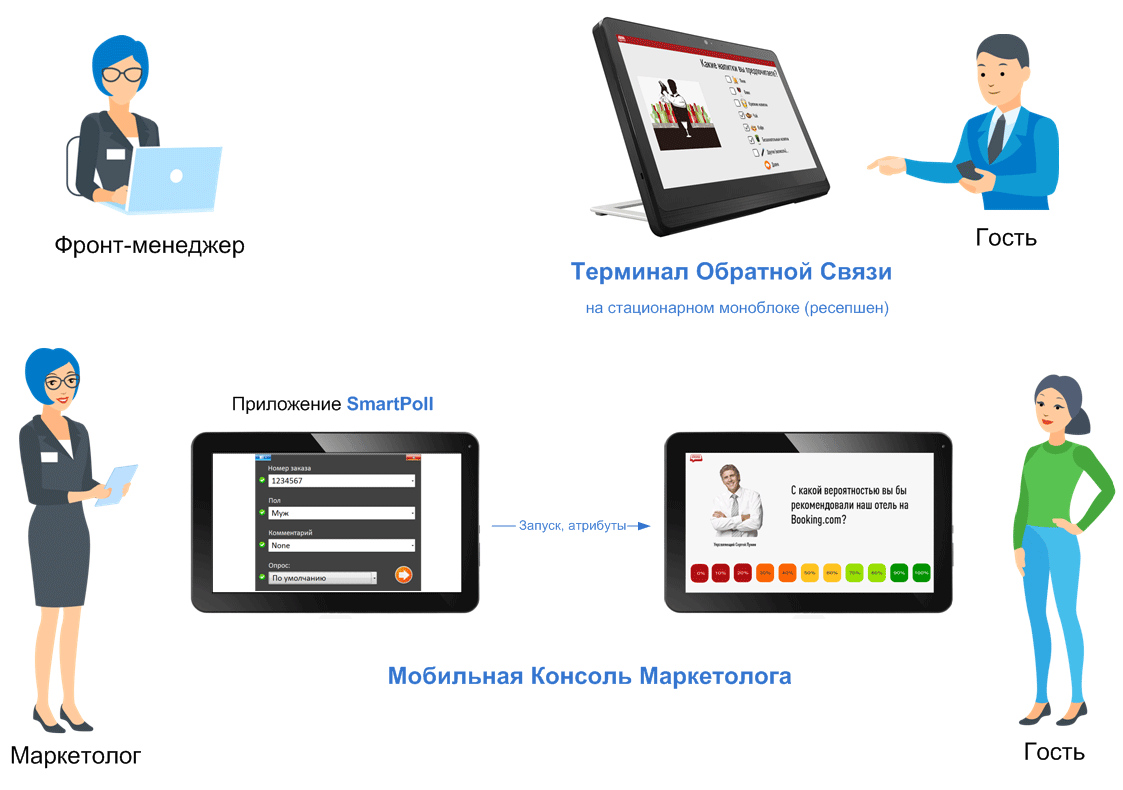 Лучшей схемой получения информации в точке контакта является Опрос с управляемой выборкой на фоне Обратной Связи. Рассмотрим, как это работает в отеле, если терминал установлен на ресепшен.