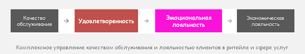 Любая компания в ритейле и сфере услуг (магазин, ресторан, салон красоты и т.д.), которая в сложившейся экономической ситуации хочет удержать своих клиентов и привлечь новых, должна управлять их удовлетворенностью и эмоциональной лояльностью. Удовлетворенность – это соответствие ожиданий клиентов тому, что они получили. Удовлетворенность зависит, в первую очередь, от качества обслуживания. Однако корреляция между удовлетворенностью и экономической лояльностью (повторные покупки) составляет только ~ 40% (информация GFK). Разрыв «заполняет» эмоциональная лояльность, которая зависит не только от качества обслуживания, но и других факторов. Цепочка выглядит так: