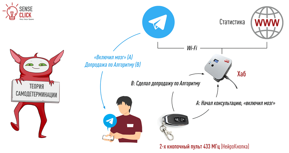 Ниже представлен алгоритм действий продавца магазина автозапчастей на этапе допродажи, основанный на Теории Самодетерминации. Алгоритм применяется при условии, что предыдущие этапы уже пройдены: выполнено «включение мозга» в соответствии с SenseClick и удовлетворена потребность, с которой клиент изначально обратился.